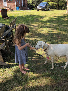 Hey and welcome back to the farm. We haven't had a whole lot going on around here lately since Frank has been pulling opening shifts at work for the past week and a half. I did manage to score 4 young chickens for our flock at an animal swap last weekend. We fixed up the coop and got them all situated in there and then got our four remaining chickens back into the coop. I thought finally I would have them off my back stoop and then I go out later in the day and the coop door is wide open! Come to find out Carl and Judith (two of our little dwarf goats) saw me throwing food in there and took it upon themselves to push the door open and go in for a snack. I never thought I would need a latch for the chicken door, the chickens weren't going to open it. Well apparently I do now. So I got that all fixed up for now and it took me FOREVER to get those chickens back in. Esp. since I was on my own with Frank being at work. I asked the girls to help but they were almost more of a hinderance, it was so cute seeing them trying though. They like to look at the chickens but not get close to them unless someone is holding them still.